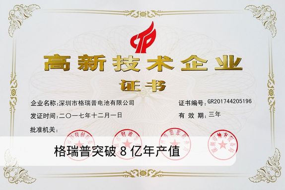 2017年,深圳市格瑞普電池有限公司通過“國(guó)家級(jí)高新技術(shù)企業(yè)”、“深圳市高新技術(shù)企業(yè)”復(fù)審,突破8億年產(chǎn)值!